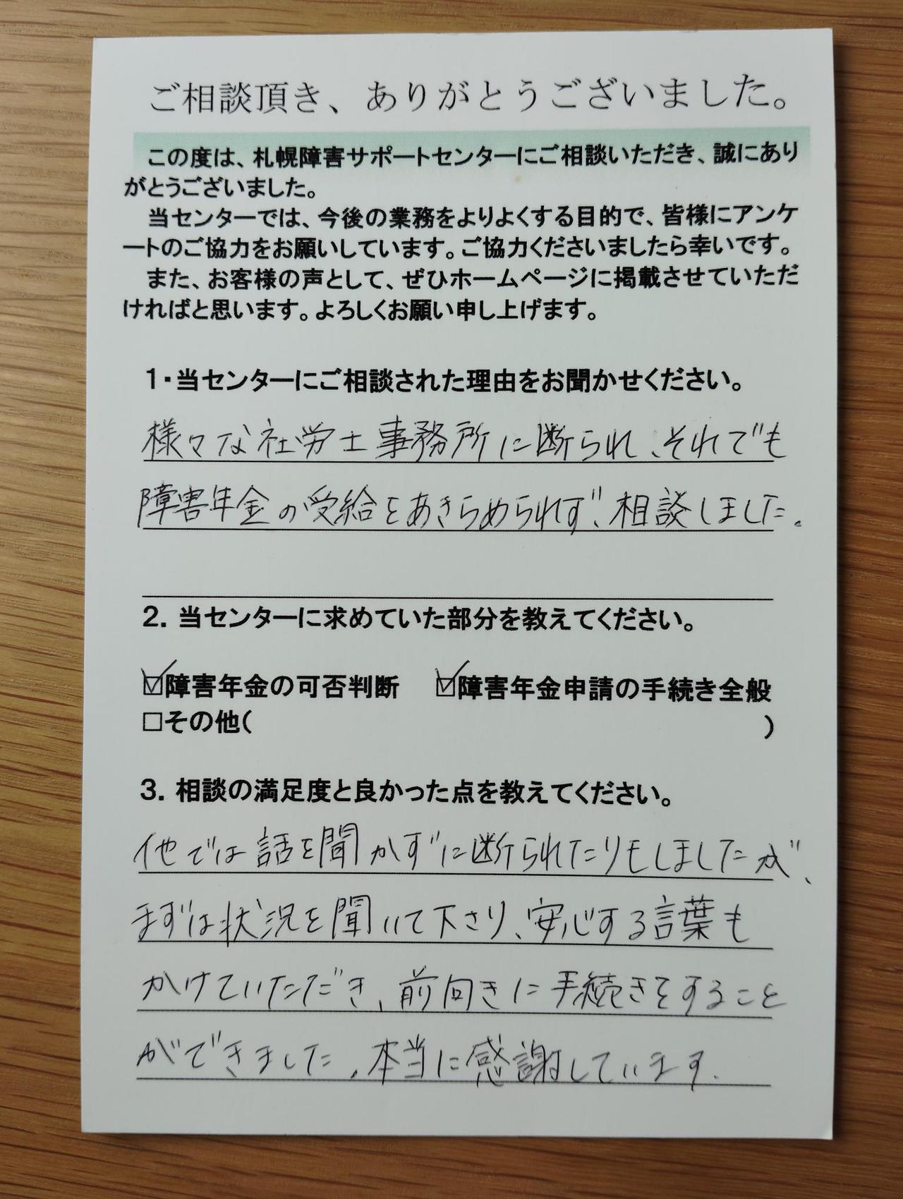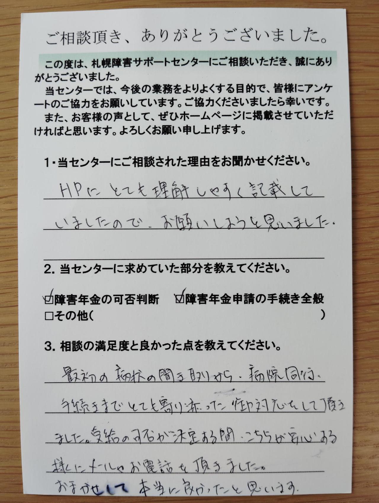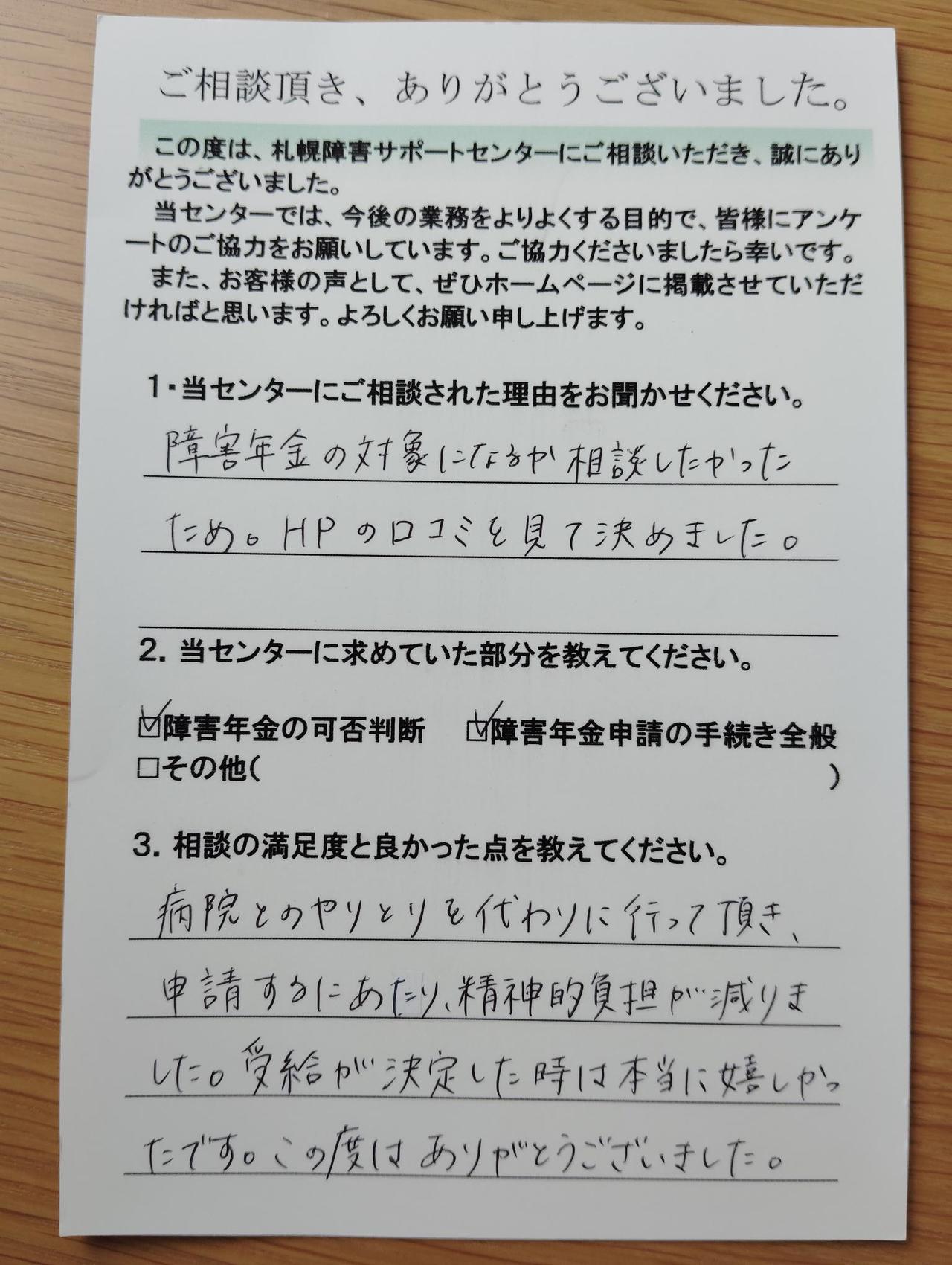 札幌からは離れた場所に住んでいますがTELで色々なアドバイスをしていただいたりこちらのいくつもの質問も聞いてくださり心強く安心して申請に向けて進めていけました。結果も障害年金2級を受給することができることになりました。大変満足して感謝しています。
