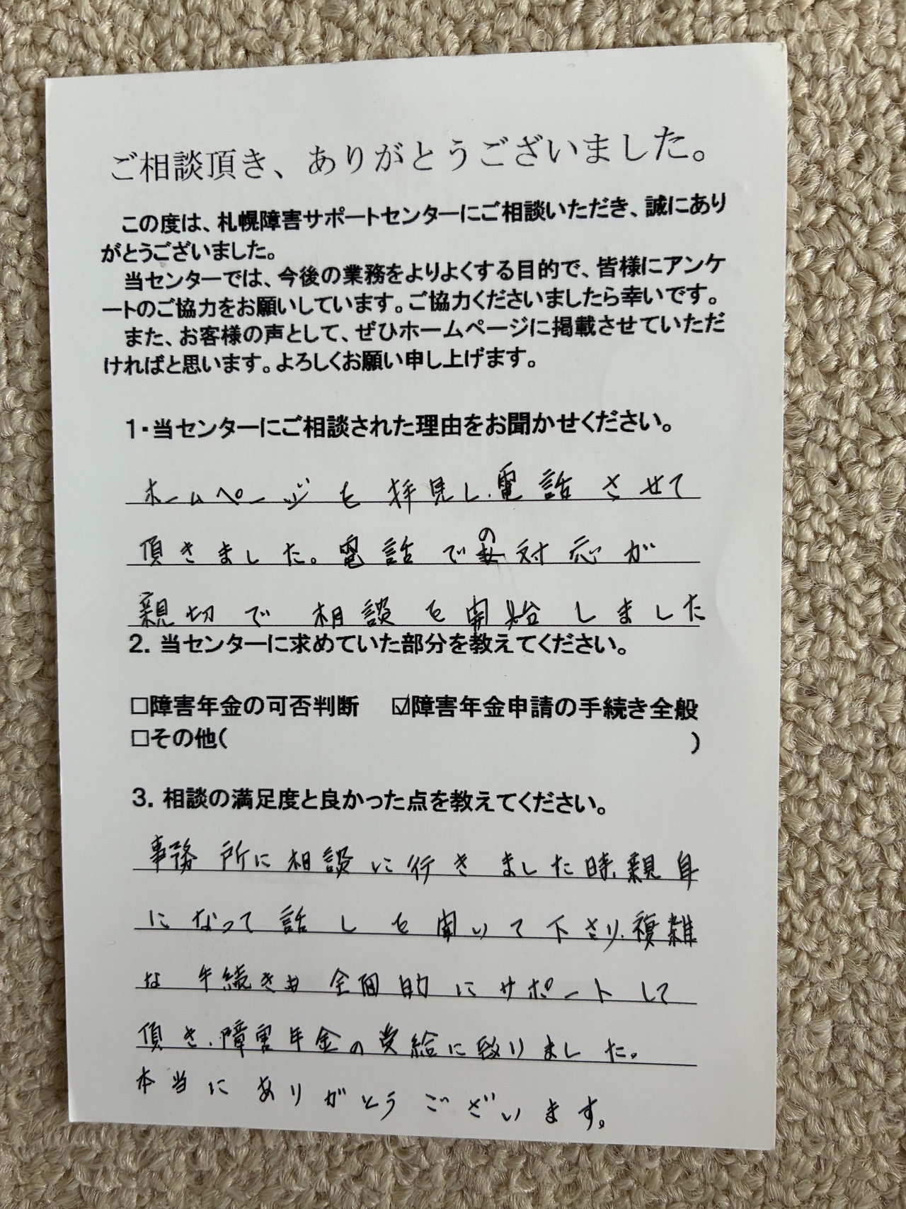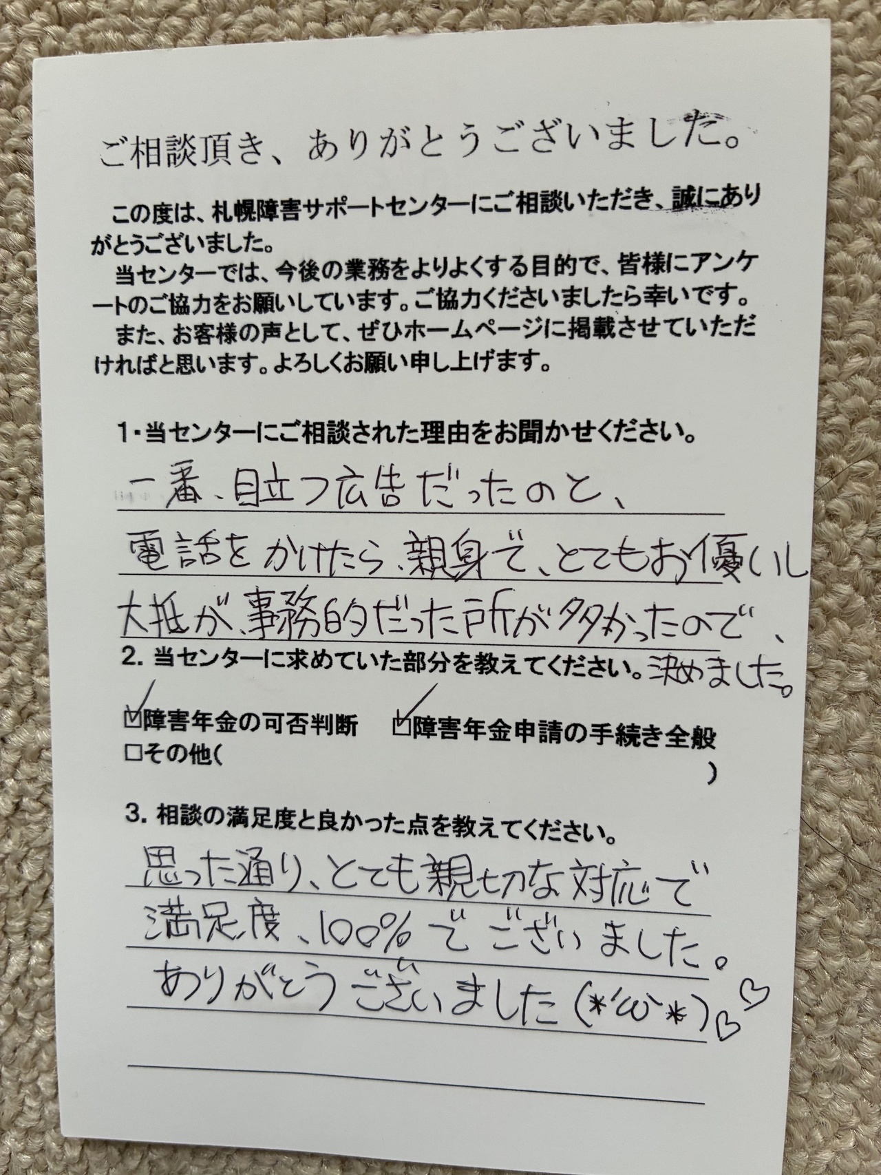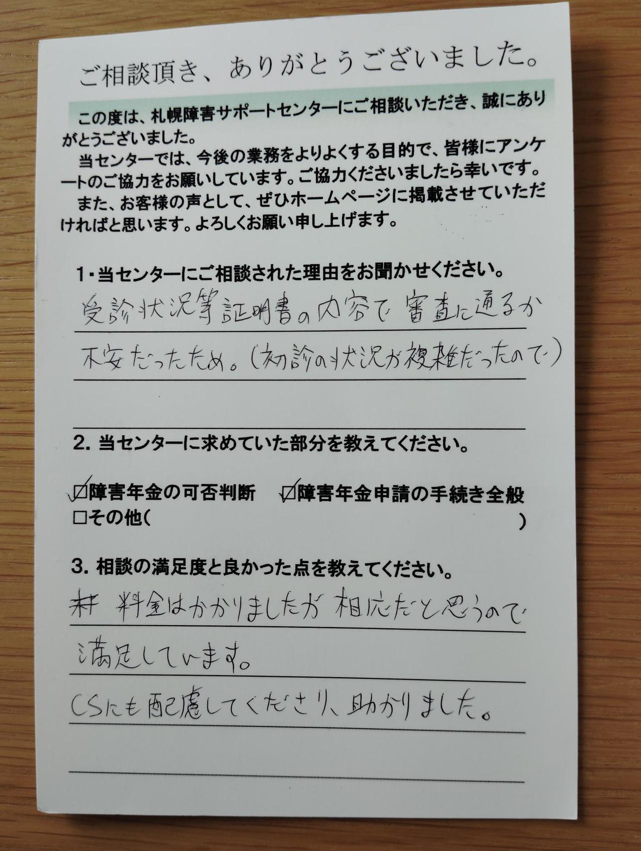 体調がすぐれない中でのアンケート記入ありがとうございました。今後も当センターは寄り添いながら申請のお手伝いをいたします。
